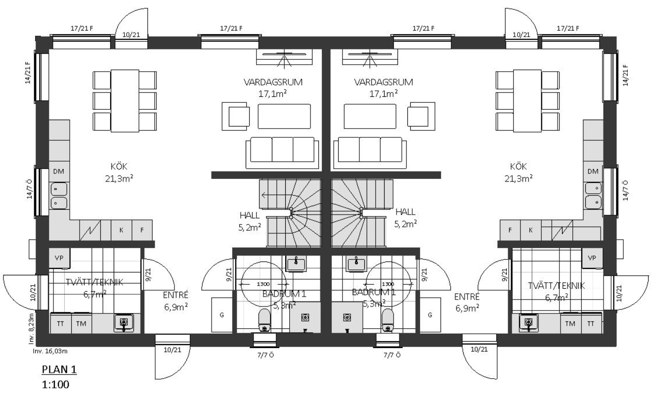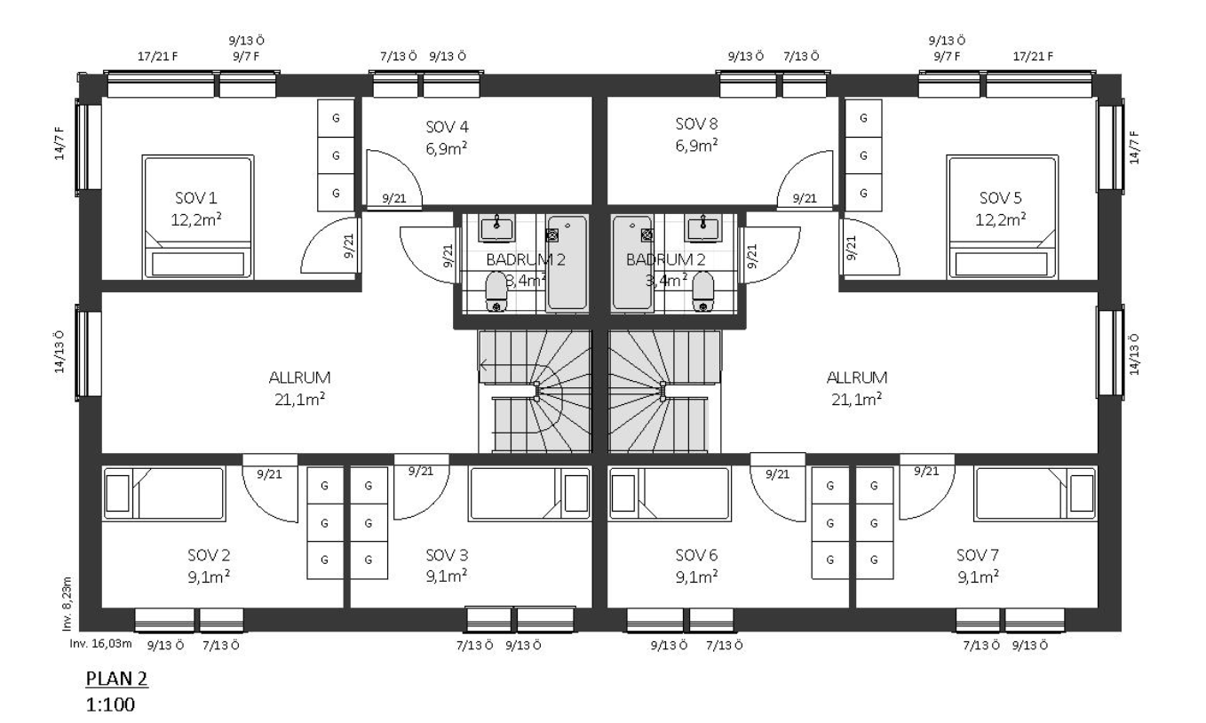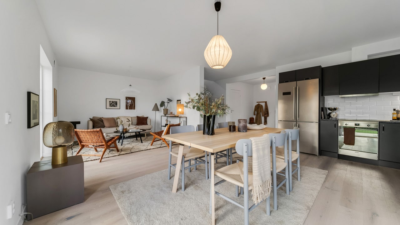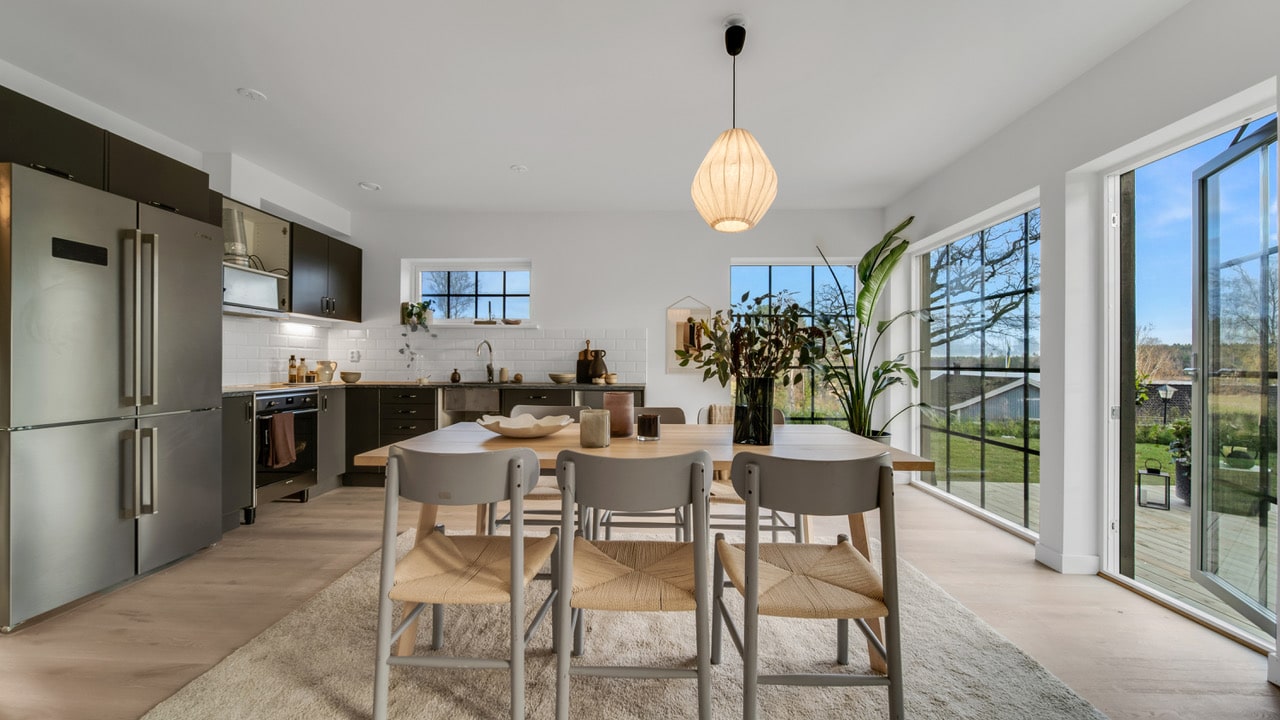 Bliźniak w stylu stodoły Dalarö to ładny dom dla dwóch rodzin lub dlaczego nie jako rezydencja pokoleniowa? Dom posiada 4 sypialnie w każdym mieszkaniu oraz otwarte strefy dzienne przylegające do kuchni i łazienek na obu piętrach.